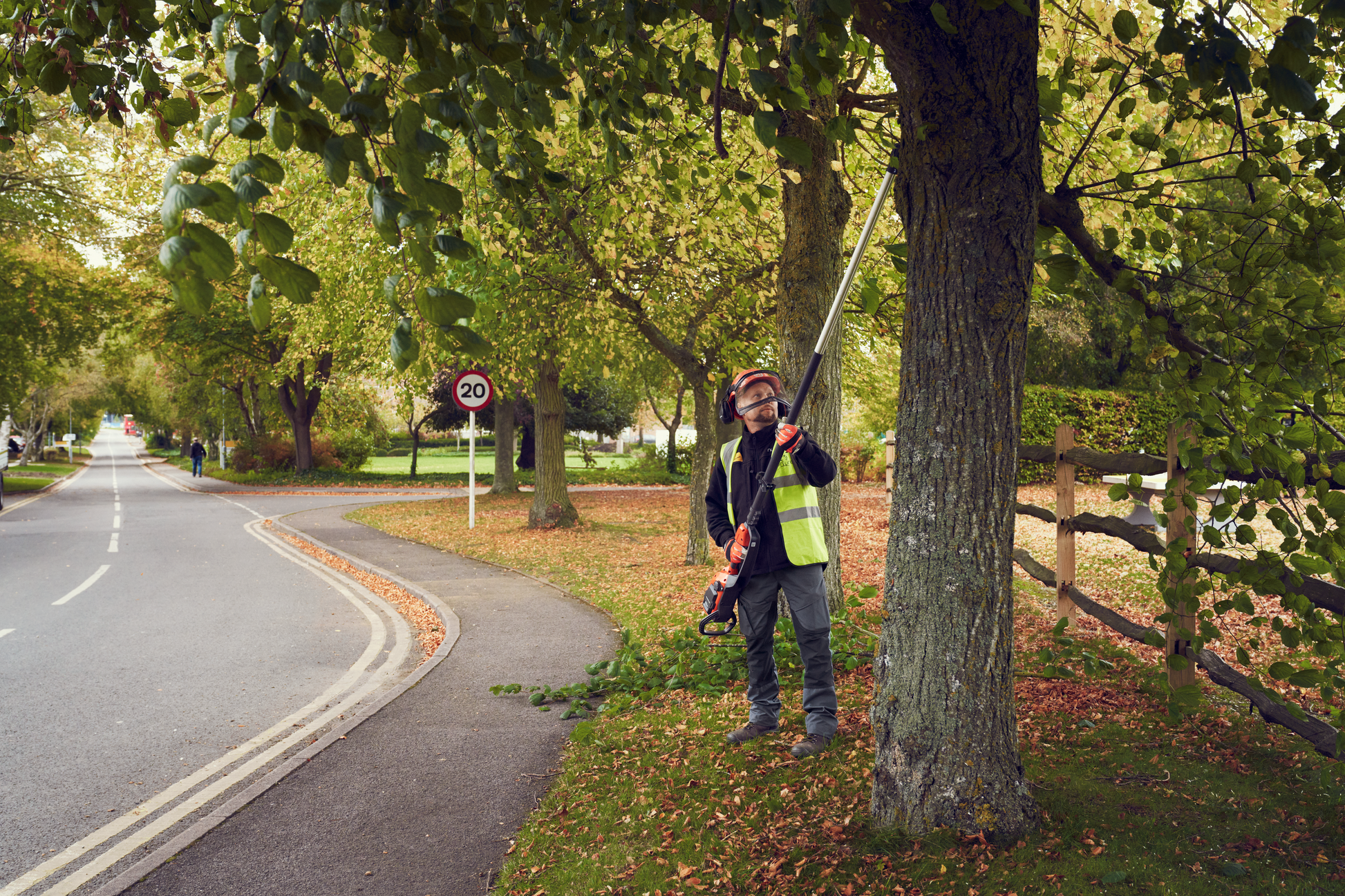 Telescopic battery pole saw for professionals, with 5m telescopic reach and performance that surpasses petrol equivalents. Maximum performance and durability with low weight, excellent ergonomics and quiet operation for use in any location at any time of day.