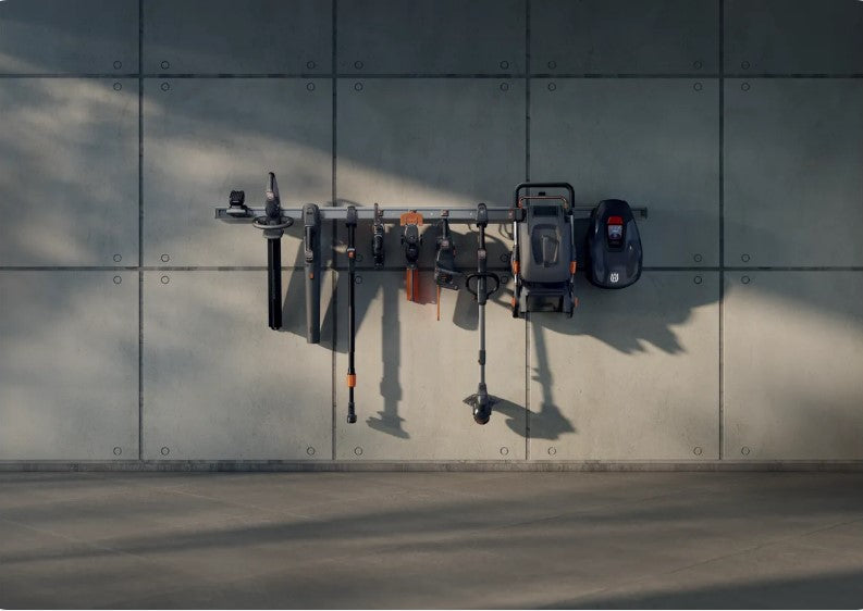 Conveniently and neatly organise your garden tools in limited space with this wall mounted storage rail. Smart, effective storage for the Husqvarna Aspire range. Each rail is 640 mm wide, so as your tool collection grows, simply extend with more rails. The 3 mm aluminium oxide ensures your storage is as premium and robust as your tools. Every Aspire product comes with a tailor-made hook to fit this wall rack. Also compatible with the Husqvarna Aspire Storage Hook kit for all your gardening tools, such as hand tools, water hose or broom. Screws, plastic plugs and end caps are included to mount the rail with a clean finished look.
