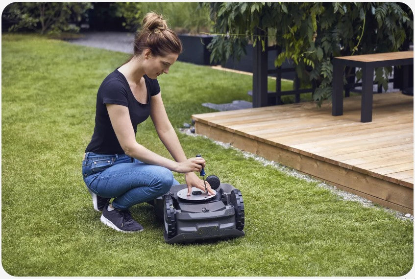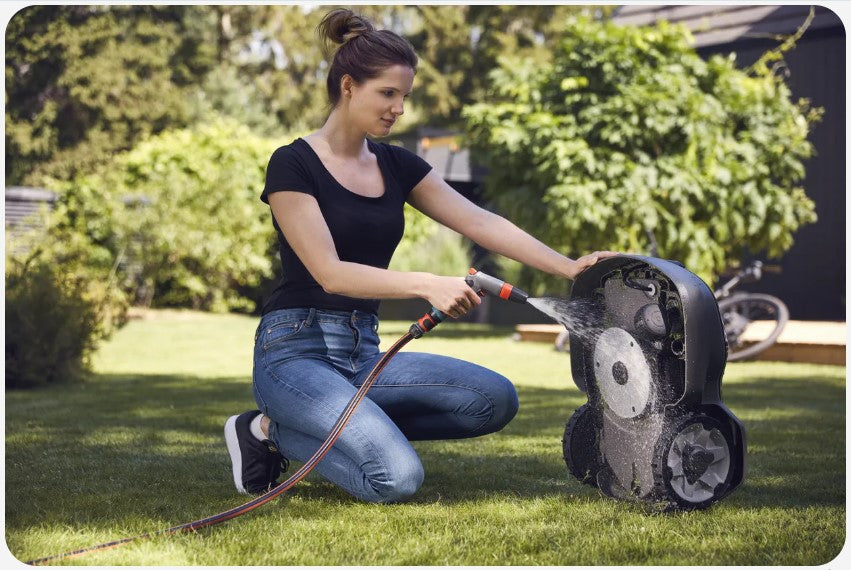 You can wash the exterior and underneath the robotic mower with a garden hose. By using the attached maintenance tool, the cover can easily be removed, for easy cleaning and reachability everywhere.