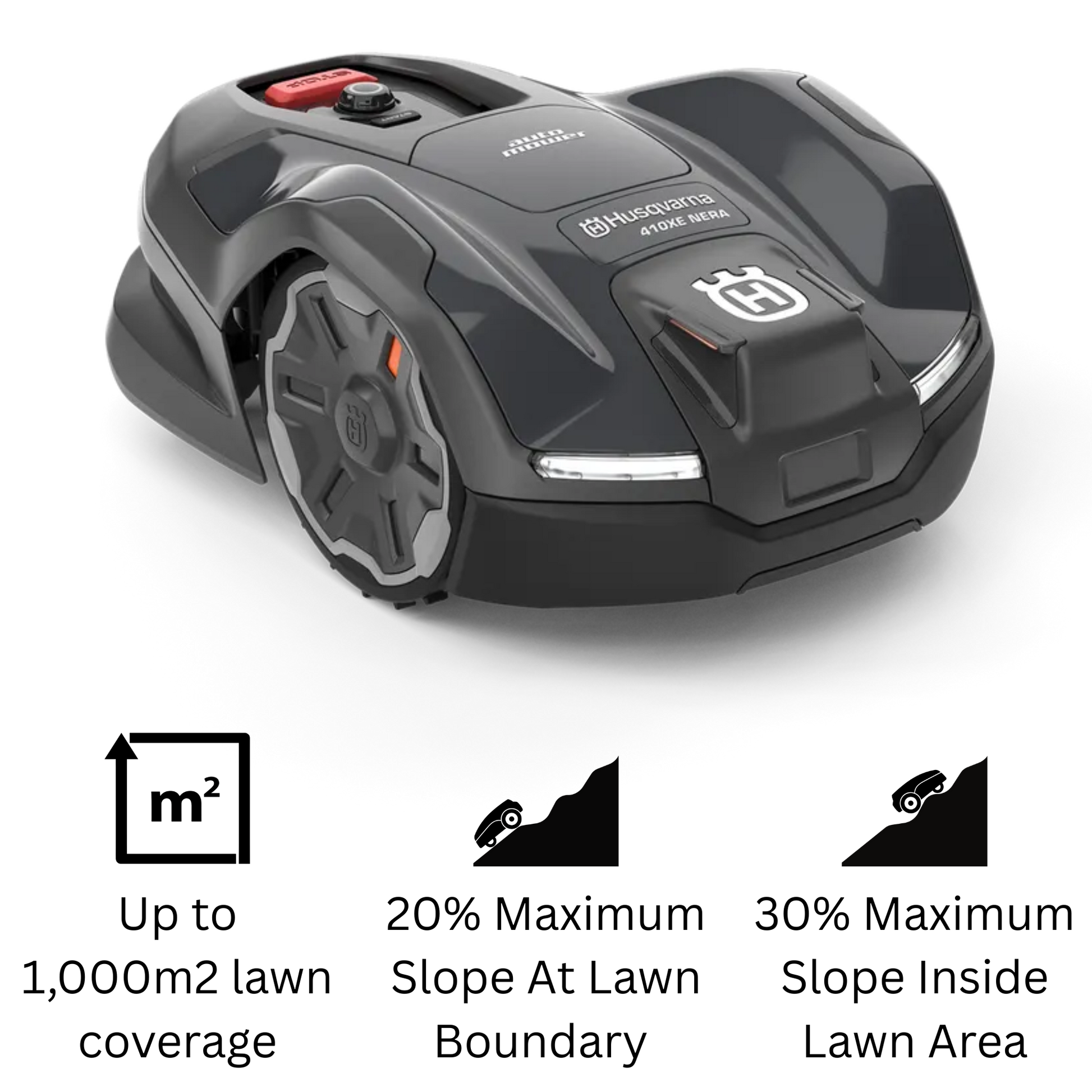 Husqvarna Automower® 410XE NERA is a robotic lawn mower for lawns up to 1000m². It comes with an EdgeCut function that minimises the need to trim the edges of your lawn, saving time and effort. 410XE NERA offers the option to choose installation with physical boundaries or wire-free installation with Husqvarna EPOS™. EPOS™ lets you experience complete flexibility with virtual boundaries, enabled through satellite-based technology with 2-3 cm accuracy. This also means there is no risk of wire breakage. Thanks to the integrated Zone Control feature, you can tailor the lawn to your needs and create several work areas with different settings via the Automower® Connect app. Just as easily, temporary stay-out zones can be created to preserve seasonal wildflowers or garden project areas.