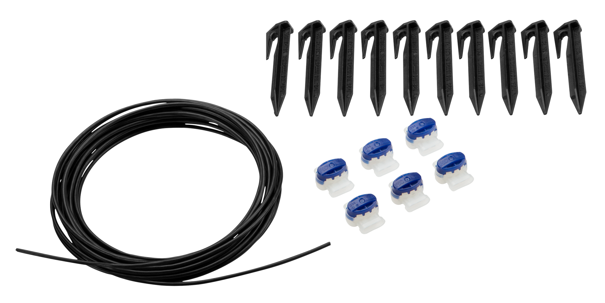 The GARDENA Repair Kit for Boundary Wire is ideal to repair your boundary wires and make small adjustments to the mowing area. With the repair set, you can easily repair the boundary wires and guide wires of your GARDENA robotic lawnmowers or adjust the mowing area to your needs. Included in the set are 5 m boundary wire, 10 hooks for fixing the cable in the ground, as well as 6 couplers. This way, you can easily connect your existing and new boundary wire.